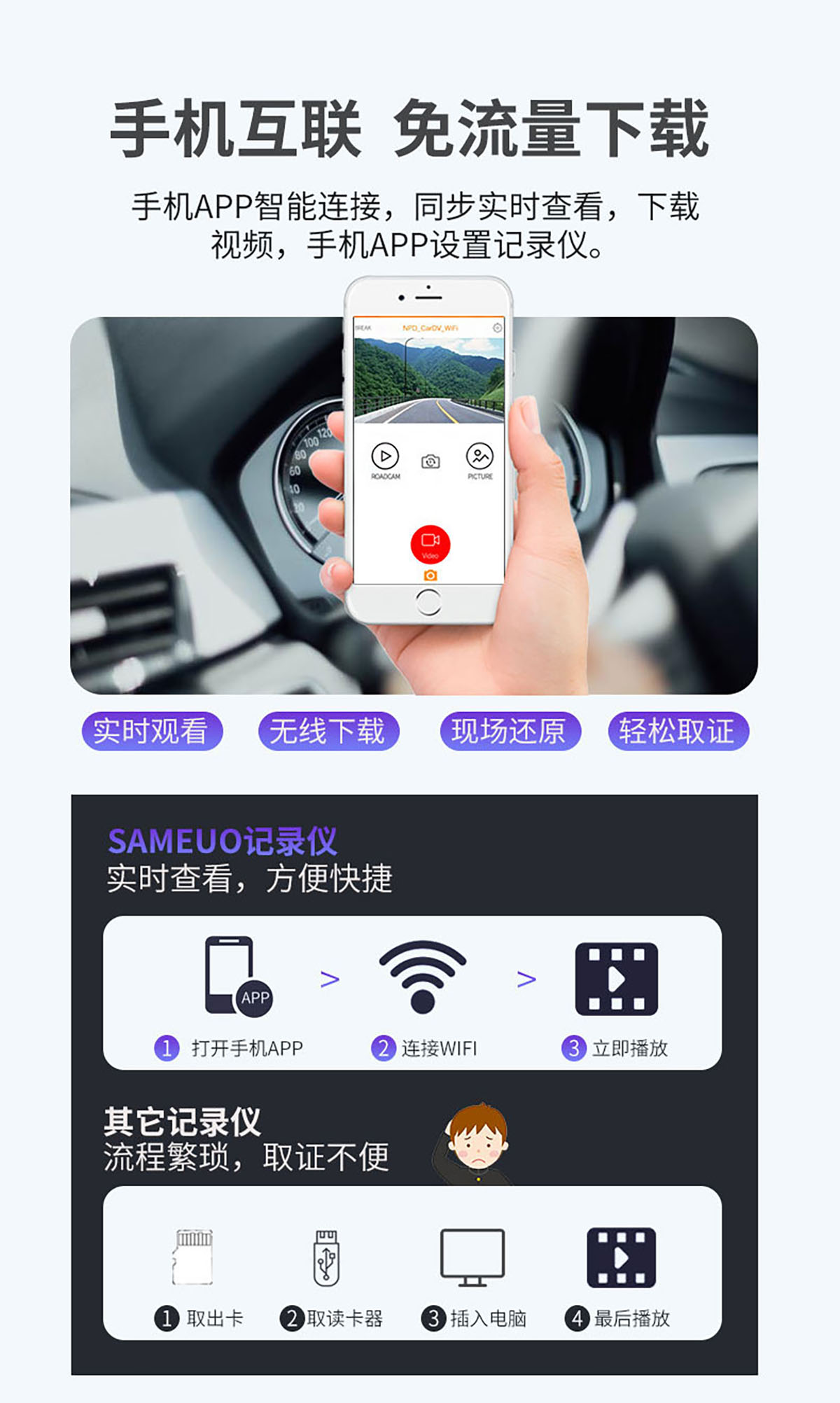 Exclusive optimization for the vehicle's power supply system, heat dissipation environment, and sensor layout: The power supply matching is more stable, avoiding the problem of battery drainage during parking monitoring. The heat dissipation efficiency is higher in high - temperature environments, eliminating issues such as crashing, freezing, and missed recordings due to exposure on the center console. For some vehicle models, it can also be linked with the original vehicle's central control and reversing camera to achieve exclusive functions such as reversing trajectory lines, providing a much better user experience than general - purpose dash cams.